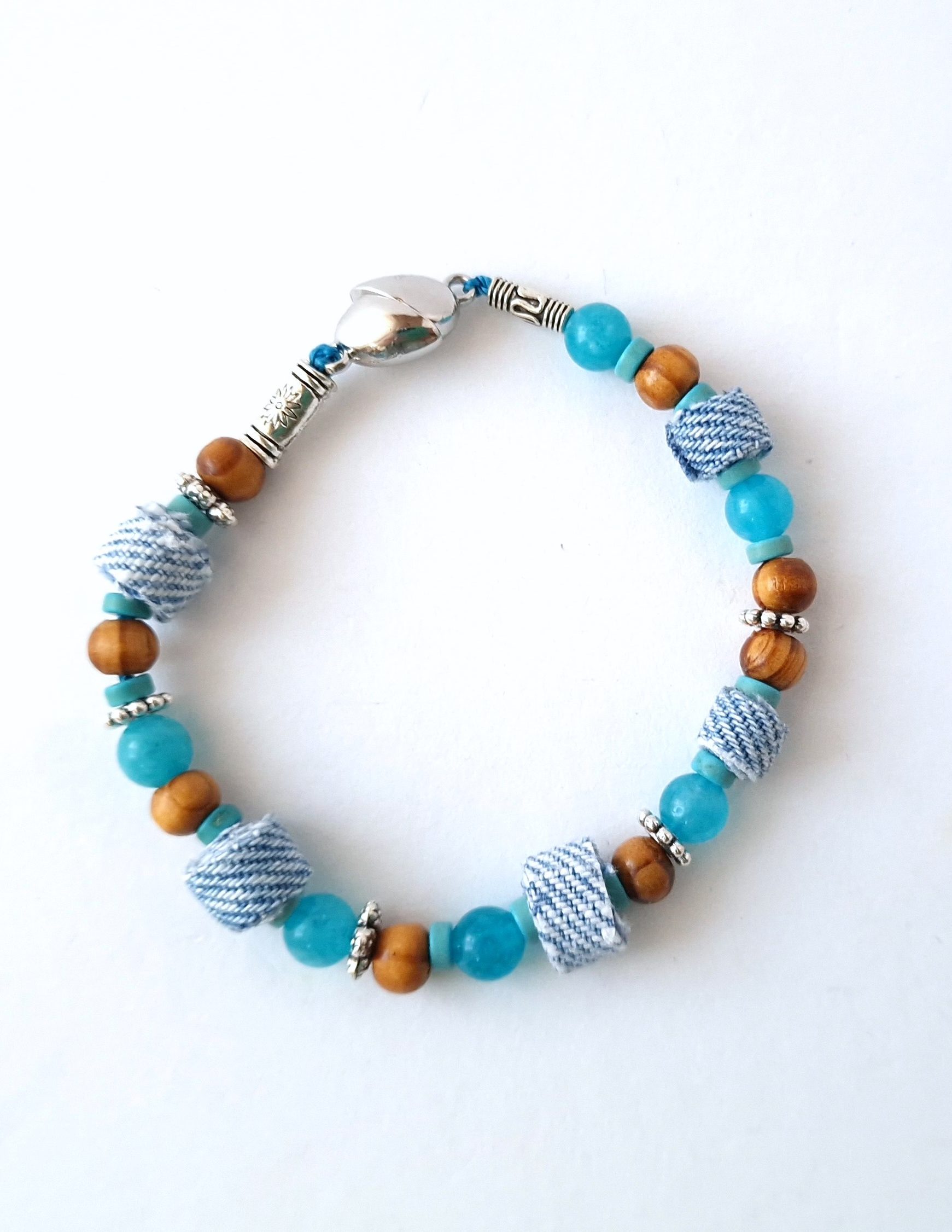 Zapestnica s perlami iz recikliranega jeansa, lesenimi kroglicami in naravnim kamnom amazonitom