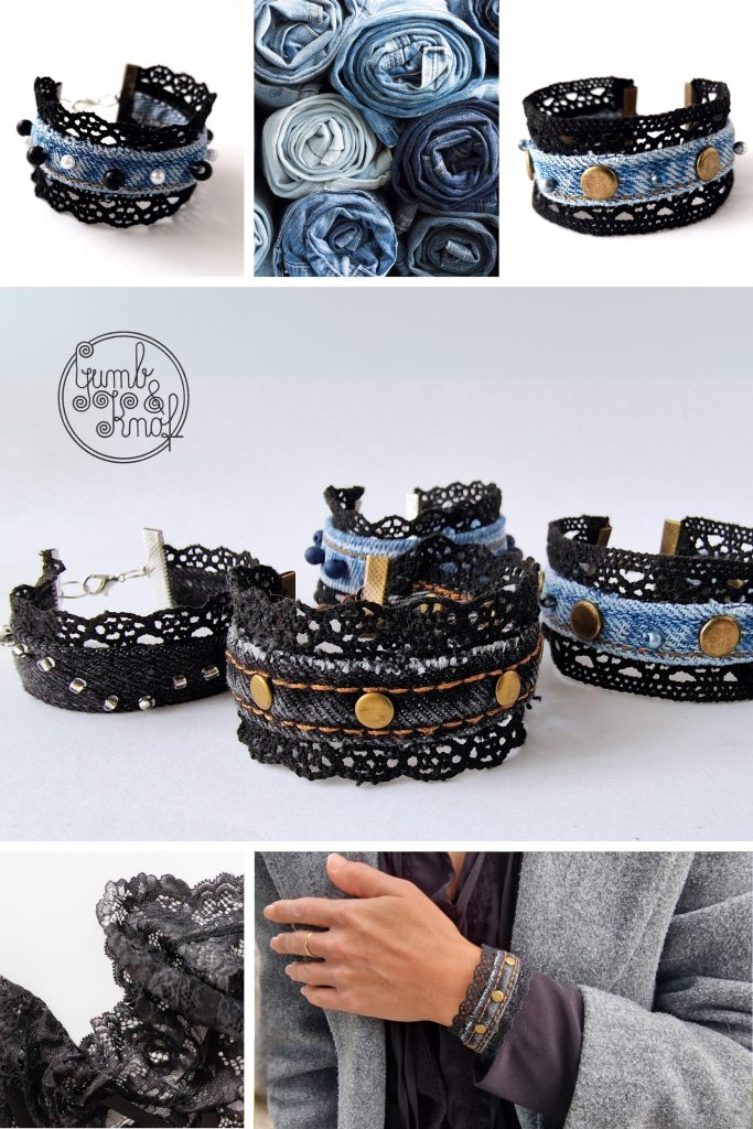 Zapestnica iz recikliranega jeansa in črne čipke, z dekorativnimi zakovicami in perlami.